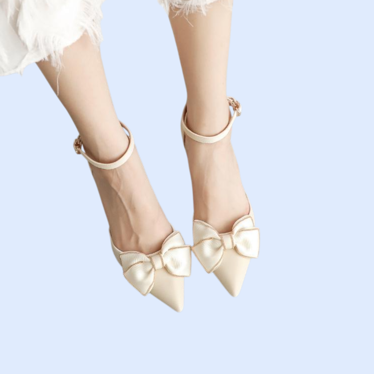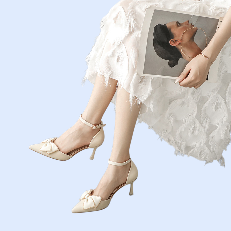 2025年秋新作、蝶結デザイン・アンクルストラップ、細ヒールで美脚効果。カジュアルにもフォーマルにも対応、快適な履き心地。